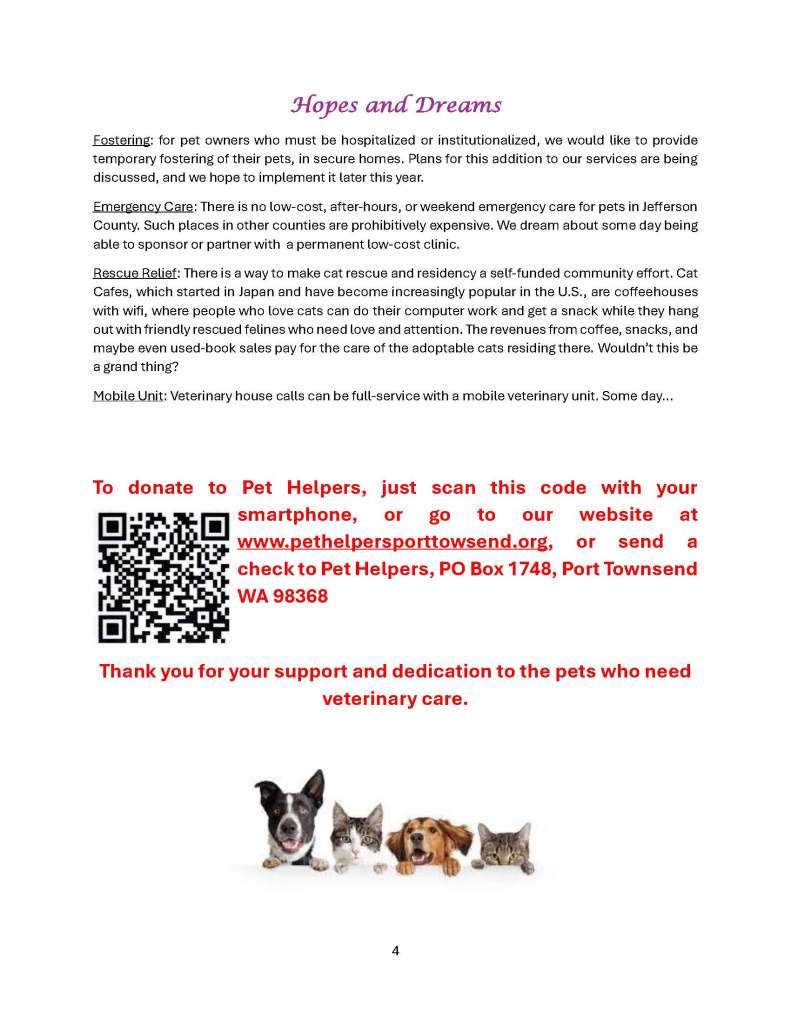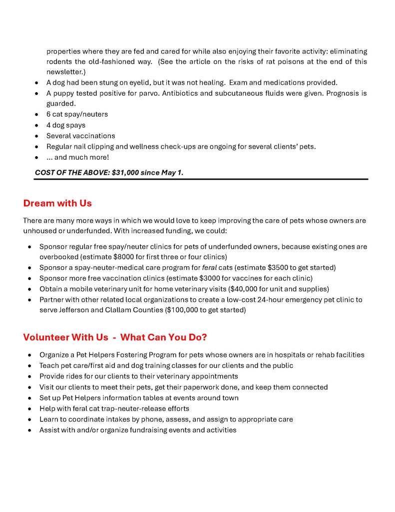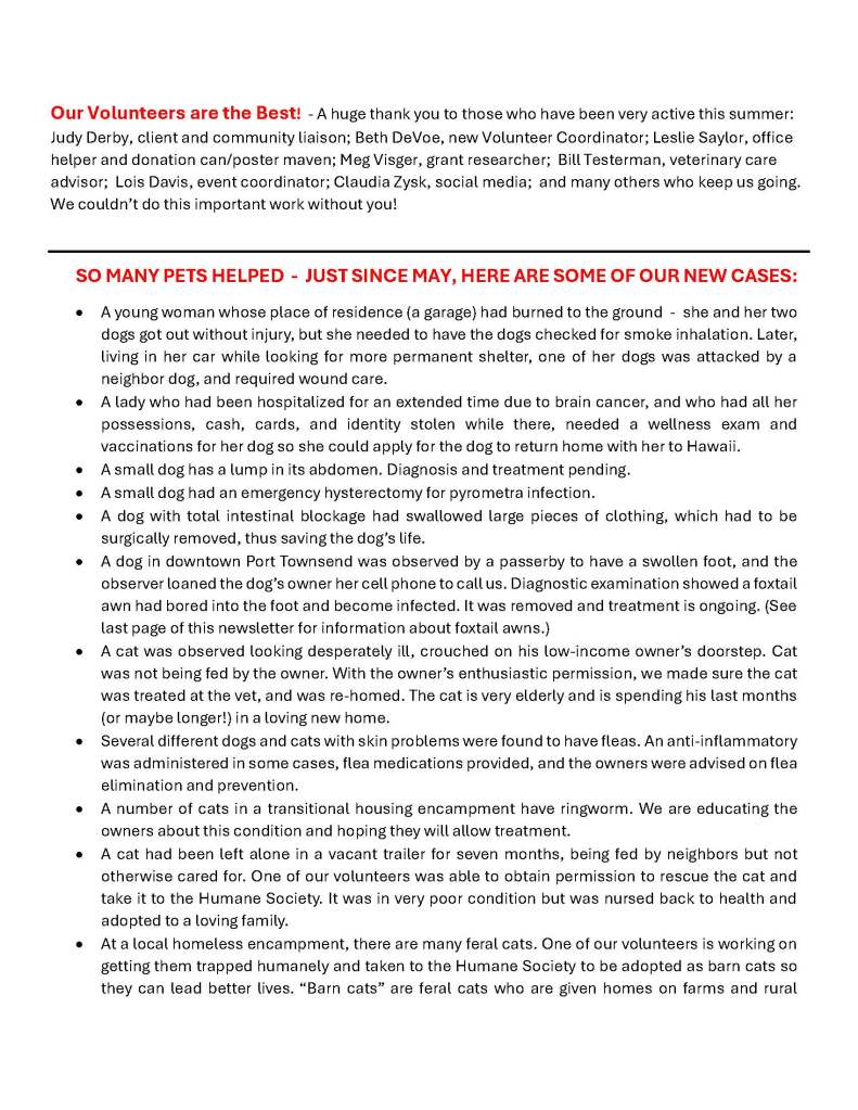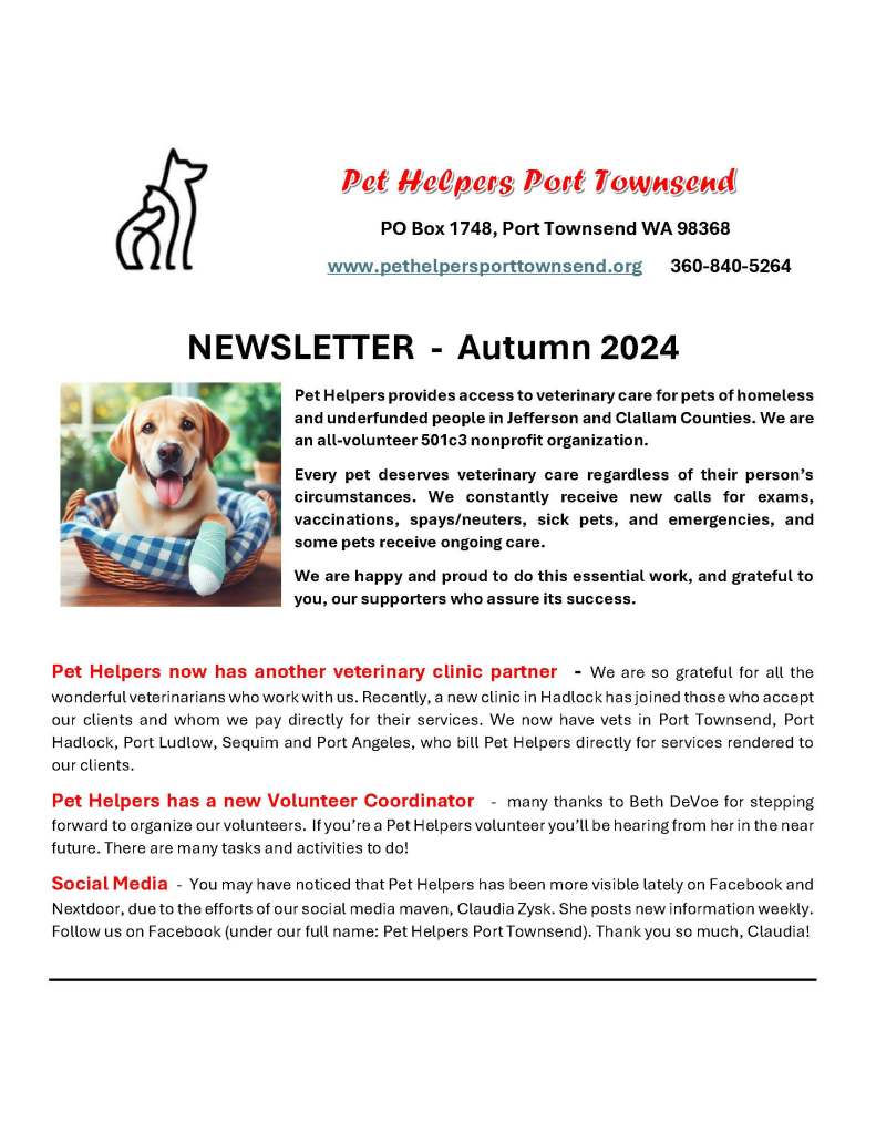 Below is our August 2024 newsletter (6 pages). To sign up to receive our newsletters by email, please email coordinator@pethelpersporttownsend.org with “Newsletter Request” in the subject line. We send three or four newsletters per year.