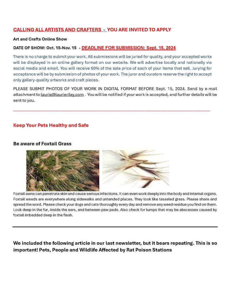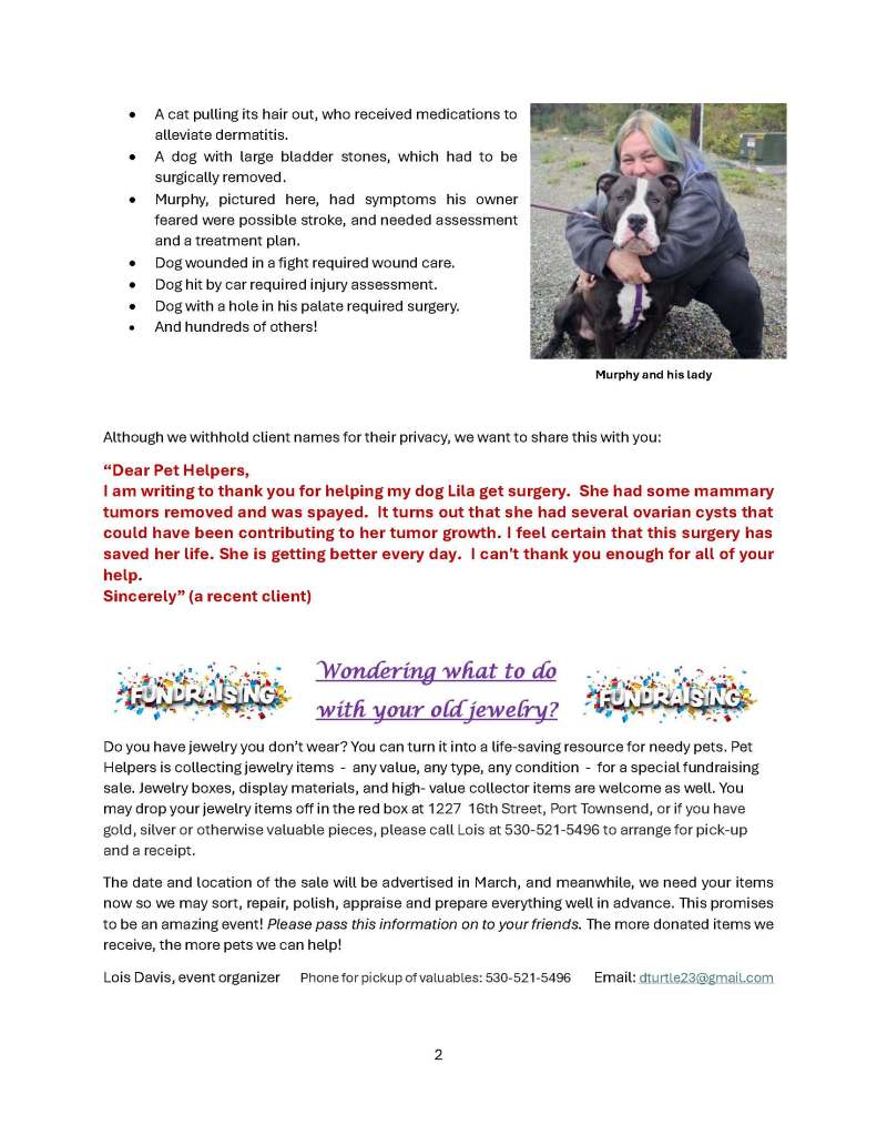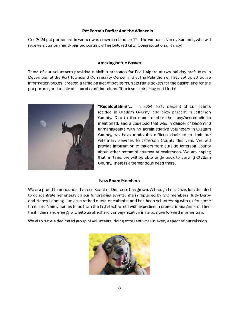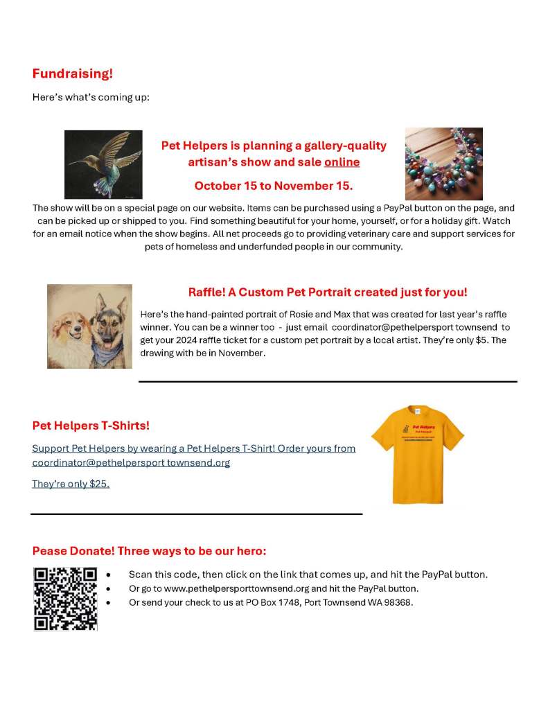Below is our August 2024 newsletter (6 pages). To sign up to receive our newsletters by email, please email coordinator@pethelpersporttownsend.org with “Newsletter Request” in the subject line. We send three or four newsletters per year.