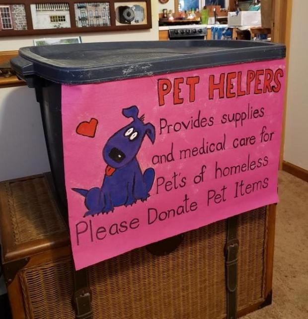 Lois has also created a pet supply donation bin that will be at various businesses on a rotating schedule. Currently it is at the Uptown Pub. The bin is for collecting new and used leashes, collars, dog blankets and coats, pet beds, toys, and so on. Some will be given to the pets of homeless people in our community as needed, and some will raise funds at our upcoming First Annual Pet Stuff Yard Sale in the spring.